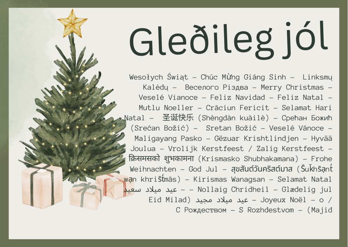 Meðfylgjandi mynd er jólakveðja skólans og má þar finna jólakveðju á þeim tungumálum sem nemendur skólans kunna.