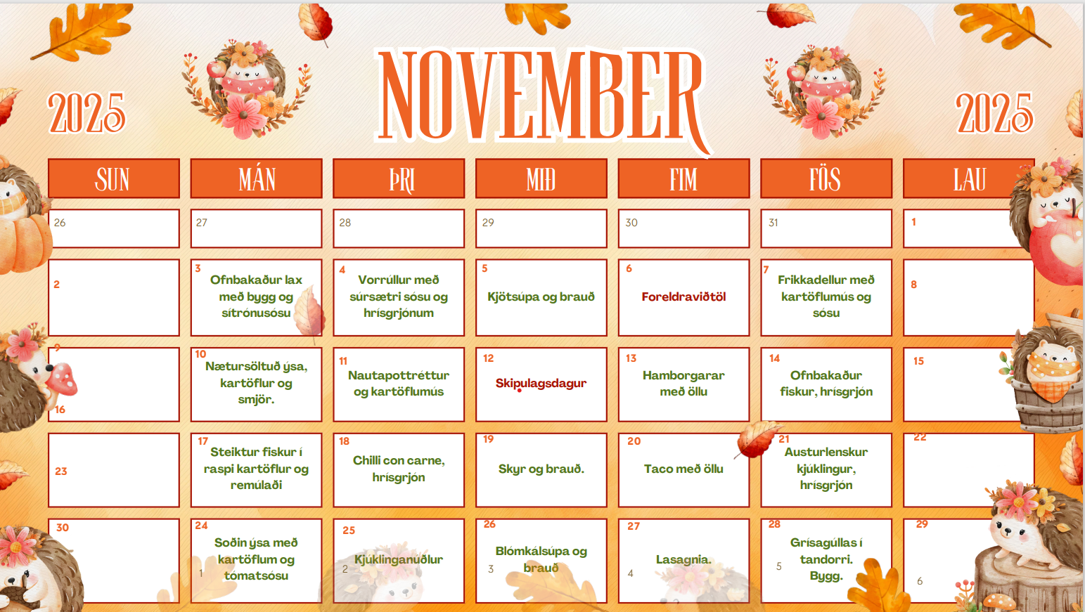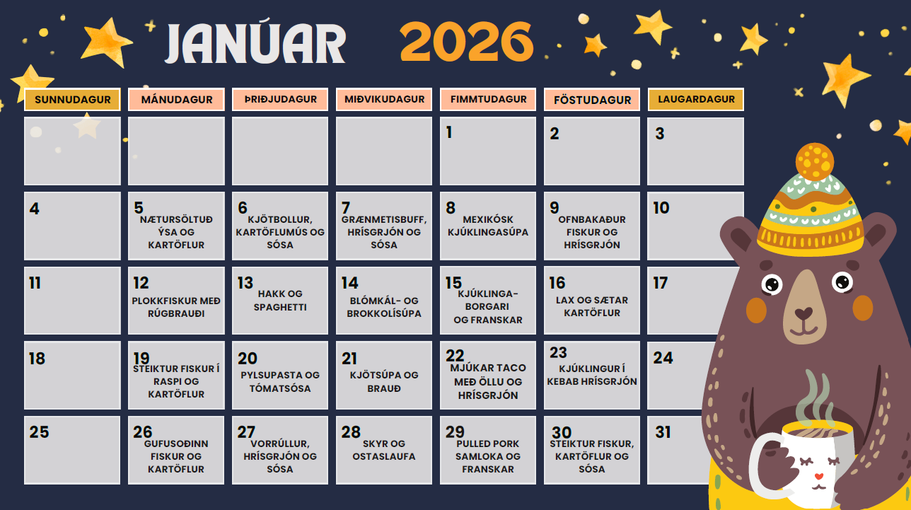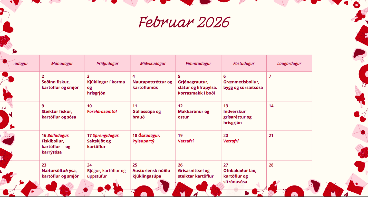 Matseðlar eru birtir fyrir 4 -6 vikur í senn og settir fram með þeim fyrirvara um að vöntun á hráefni hjá birgjum geti leitt til breytinga. Við gerð matseðlanna er stuðst við leiðbeiningar frá embætti landlæknis.